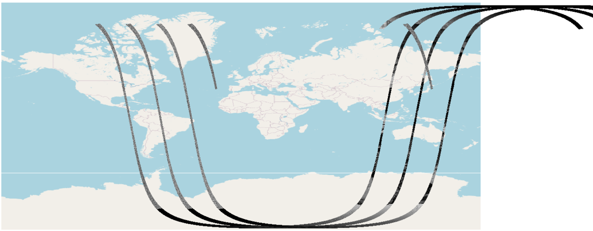 3パス分のVisibleバンドのデータをQGISで表示してみました。 東経・西経180度をまたぐ場合、西経を東経側に座標をとってるので地図からはみ出てますが...