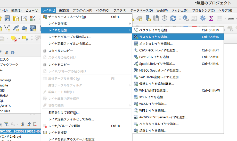 上部タブのレイヤ -> レイヤを追加 -> ラスタレイヤを追加 をクリックします。