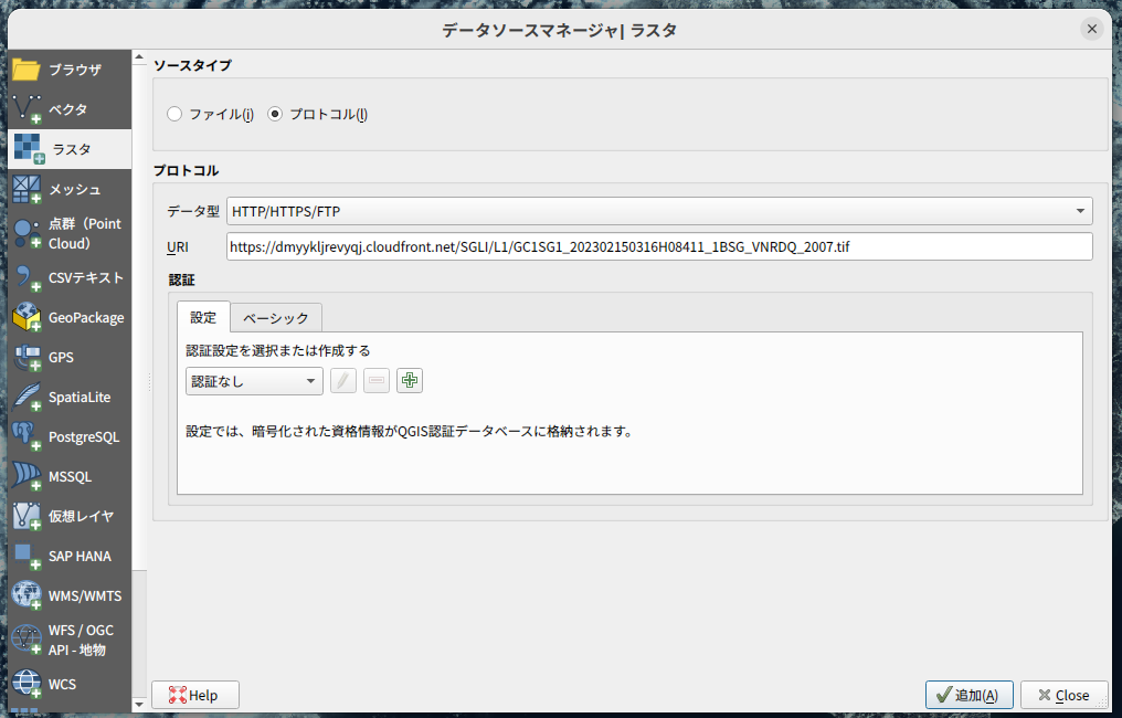 ソースタイプは「プロトコル」、データ型は「HTTP/HTTPS/FTP」、URIはCloudFrontのURLを入力します。