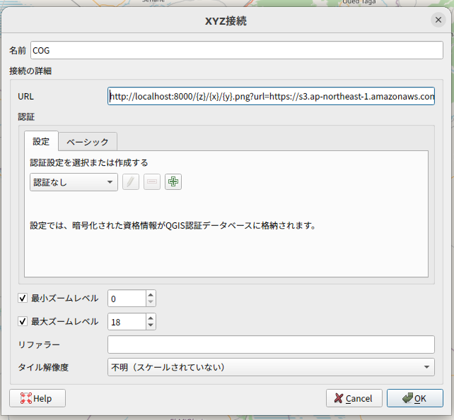 現れたウィンドウに名前は適当に入力し(ここではCOGとします。) URLは先程curlを実行したときに返された "tiles"にあるURLを入力します。最後にOKをクリック